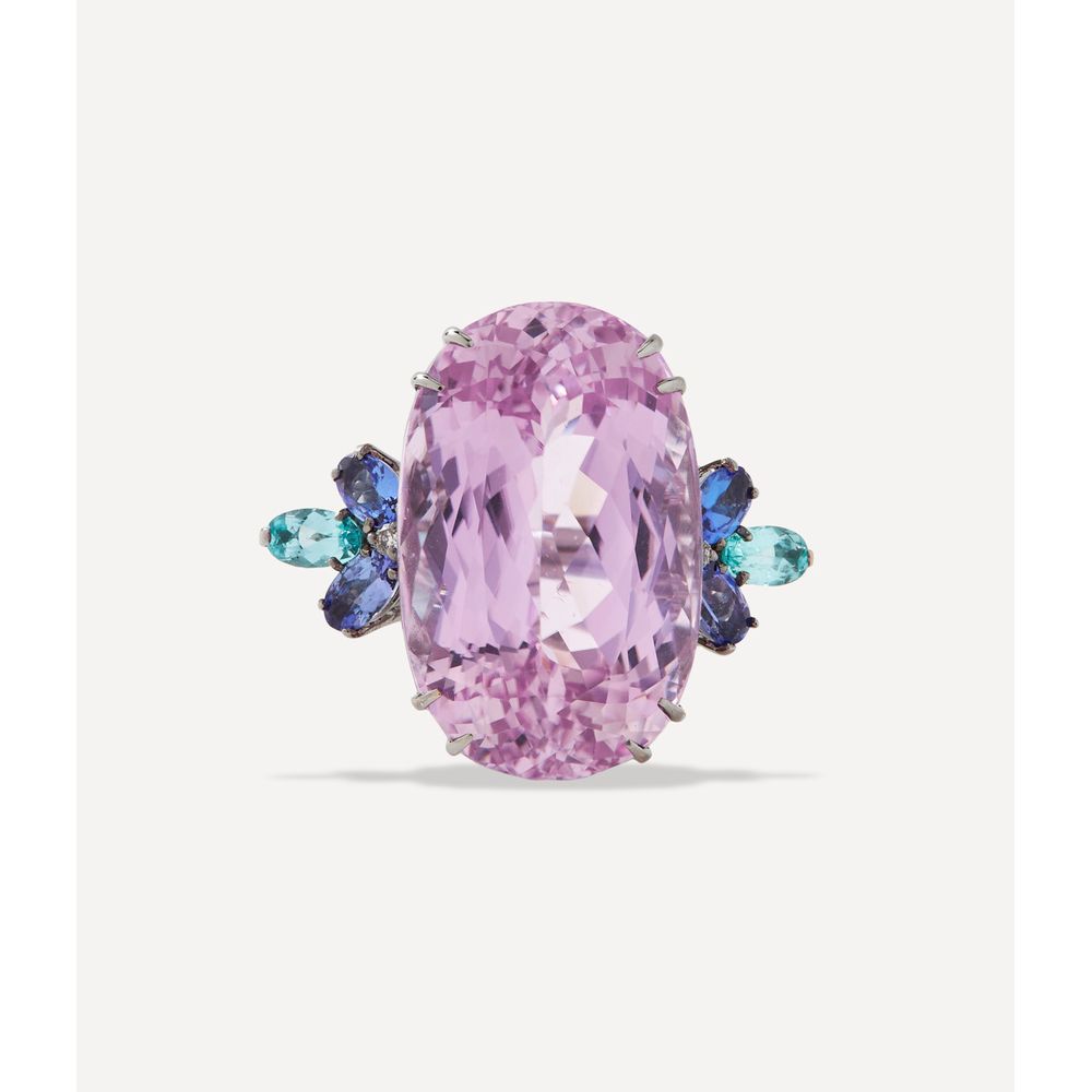 Anel fusion kunzita tanzanita em ouro negro 18kt. Este anel possui kunzita 36.260ct, tanzanita 1.000ct e granada 0.510ct.
