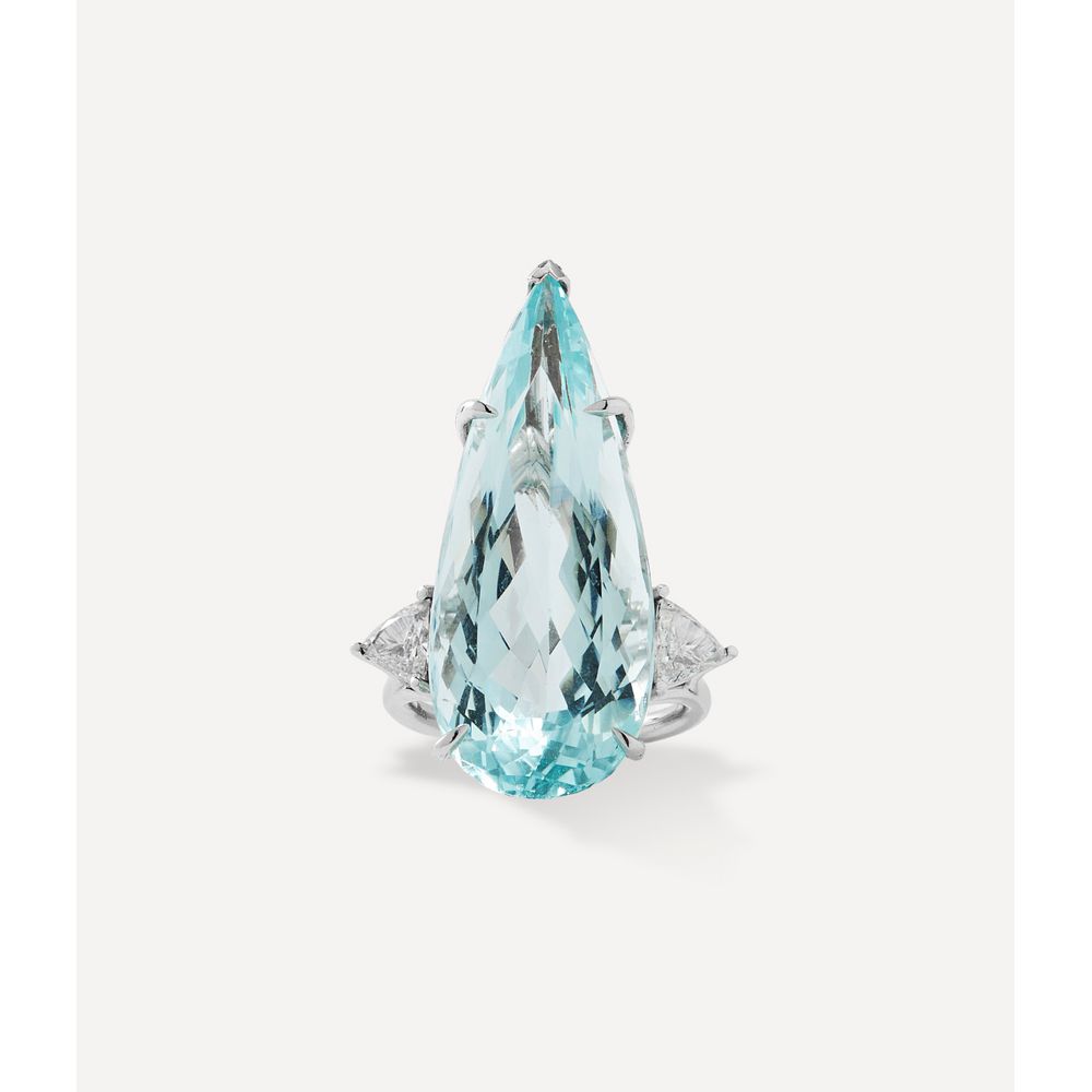 Anel solitário em ouro branco 18kt. Este anel possui água marinha em lapidação gota 24.850ct e diamantes trillion 0.790ct.