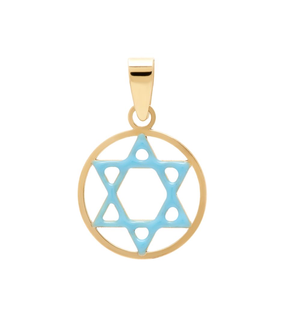 Berloque infantil em ouro amarelo 18kt. Modelo redondo com estrela de davi pintada com esmalte azul.