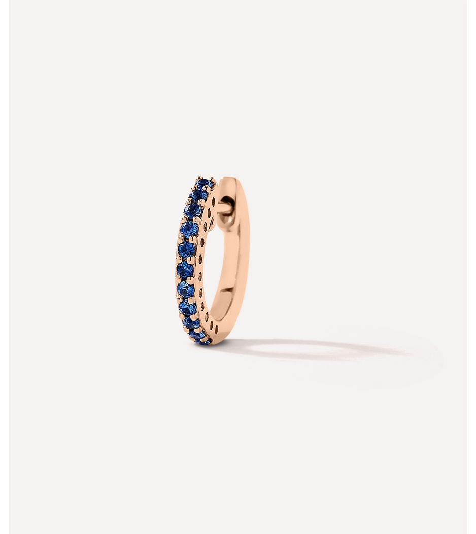 Brinco de argola único em ouro rosa 18kt. Esta argolinha possui safiras azuis 0.17ct em lapidação brilhante.