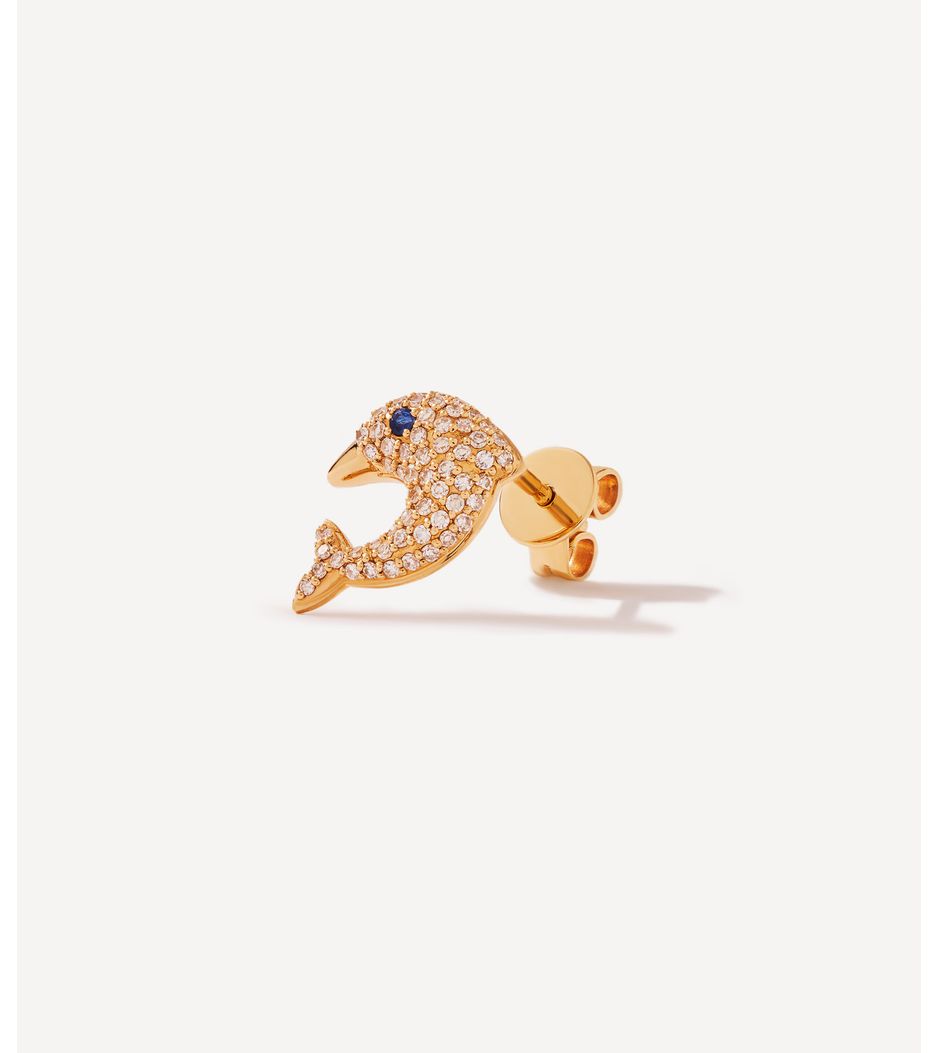 Brinco stud único diamond dolphin em ouro amarelo 14kt. Este brinco possui diamantes 0.32ct e safiras 0.03ct, ambos em lapidação brilhante.