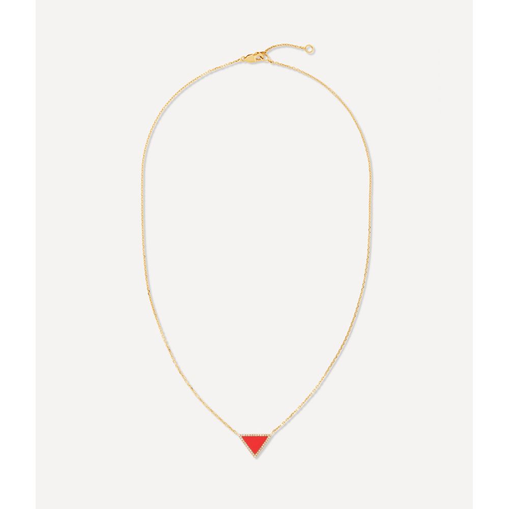 Colar pendente triangulo coral em ouro amarelo 14kt. Este colar possui diamantes 0.110ct. Tem 43cm.