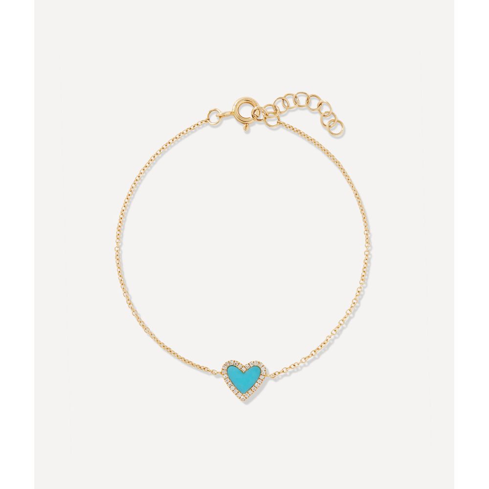 Pulseira baby heart turquesa em ouro amarelo 14kt. Esta pulseira possui microcravação de diamantes 0.60ct e turquesa 0.130ct em lapidação coração.