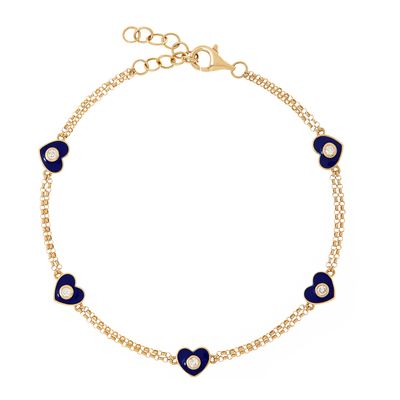 Pulseira coração em ouro amarelo 14kt. Esta pulseira possui diamantes 0.53ct em lapidação brilhante. Essa peça possui corrente dupla de 18cm e 3 contra argolas, sendo possível ajustar o tamanho.