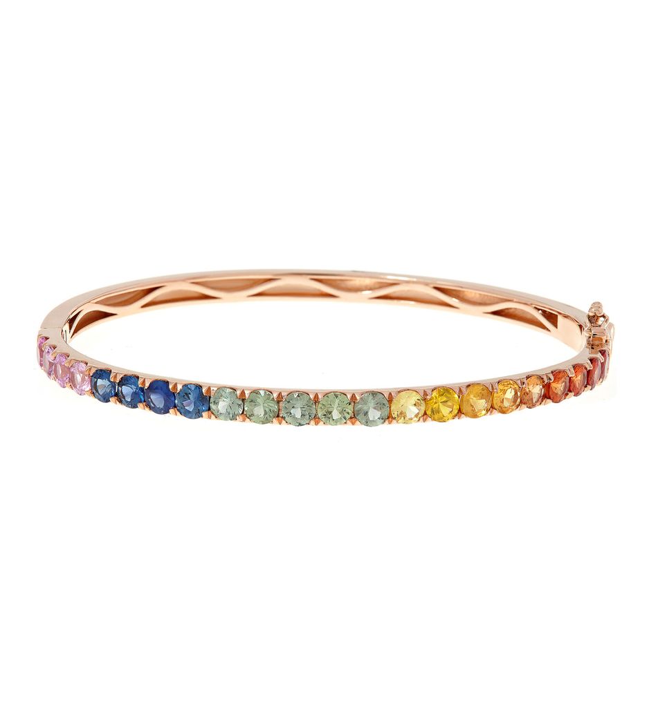 Pulseira rígida rainbow em ouro rosa 14kt. Esta pulseira possui safiras coloridas 4.63ct em lapidação brilhante. Essa é uma peça de tamanho único. Essa é uma peça de tamanho único.
