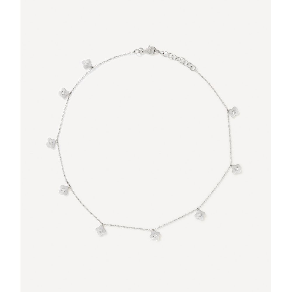 Tornozeleira flor em ouro branco 14kt. Esta tornozeleira possui diamantes 0.18ct em lapidação brilhante. Tem 30cm e contra argolas, sendo possível ajustar o tamanho.